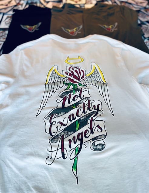 This standout tee from Not Exactly Angels is draped in old-school tattoo art—featuring a rose stem rising through a scroll of rebellion, angel wings spread wide, and a golden halo that’s more ironic than innocent. It’s a nod to those who live in the in-between—not evil, not pure. Just real.